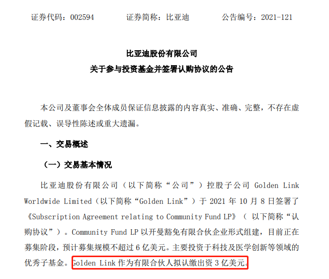越来越多上市公司投身VC/PE圈。三天前,比亚迪发布公告称,拟认缴出资人民币1亿元投资粤港澳大湾区科技创新产业投资基金,该基金专注于投资粤港澳大湾区科技创新关键领域。而10月初,比亚迪刚刚出手3亿美元投资母基金Community Fund LP,主要投资于科技及医学创新等领域的子基金。