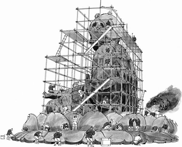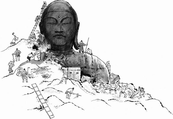 这时候大佛还整个埋在土里,外表看来似乎只是一座小山丘。工人们开始将覆盖的泥土和外铸型一点点移除。