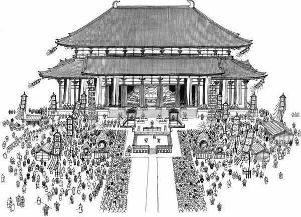 757年(天平胜宝九年)五月二日,1500 名僧侣聚集在东大寺,举行圣武帝逝世周年忌法会,此时的大佛闪耀着金黄色的光芒。
