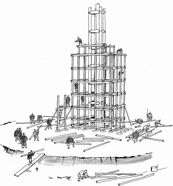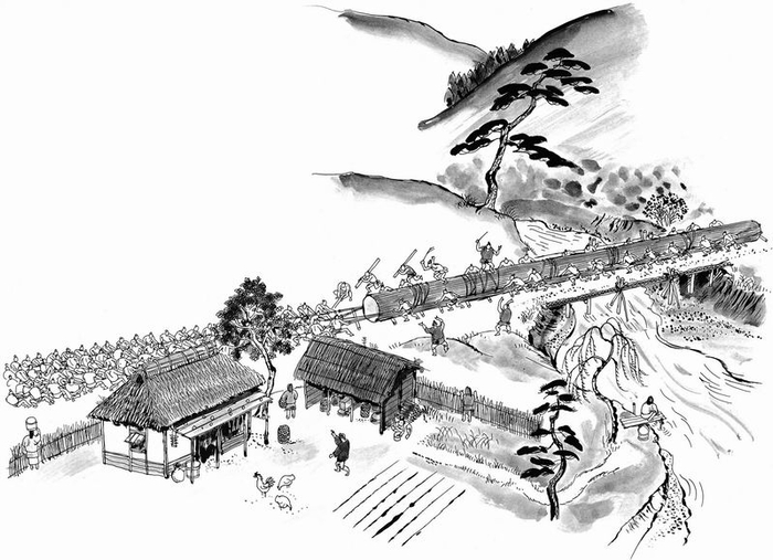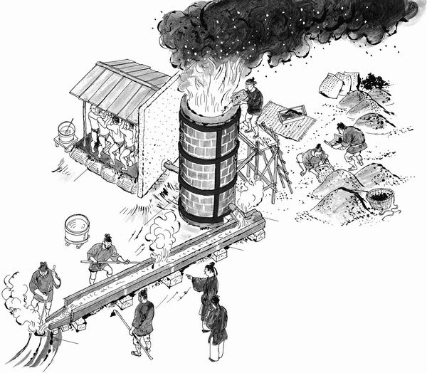 铸型完成以后,人们开始准备炼铜用的熔炉,以及将铜液导入铸型内的导沟(称为 “樋”)。