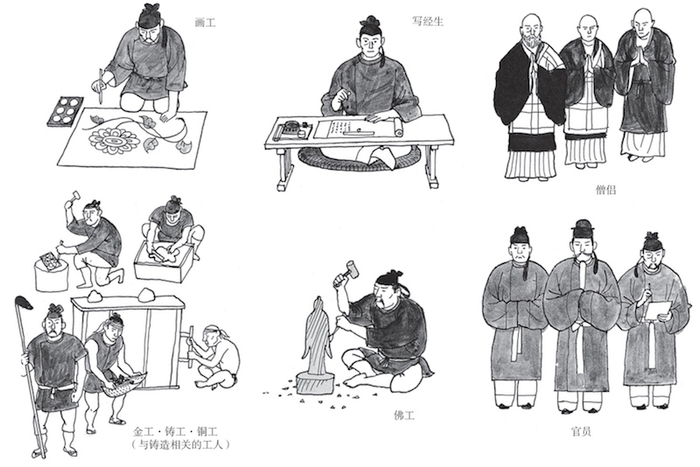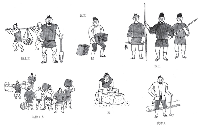 工人细分为佛工、画工、金工、铜工、木工、砖瓦工、刻石工、搬土工等工种,整体的分工合作制度相当完备。