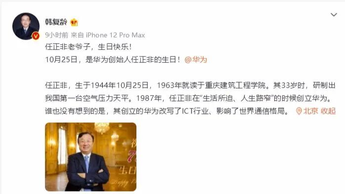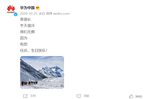 2020年10月25日,华为中国官方微博表示:“夜很长,冬天很冷,我们无惧,因为有您。任总,生日快乐!”