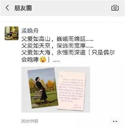 2019年10月25日, 在任正非75岁生日当天,华为“心声社区”贴出其女孟晚舟朋友圈的最新截图。在这条朋友圈中,孟晚舟用排比句“父爱如高山、如天空、如大海”以表达对父爱的感谢,并祝父亲任正非“生日快乐”。这条朋友圈还附上了一张孟晚舟的照片和署名“猪儿”(孟晚舟)致“老爸”的信。