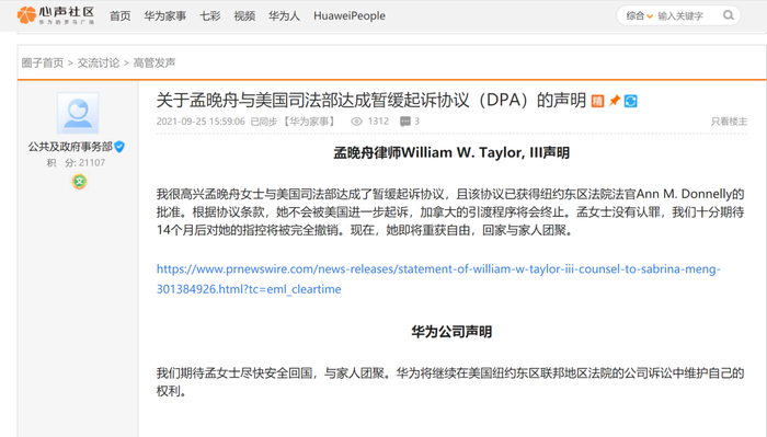 此前9月25日,华为心声社区发布《孟晚舟律师William W. Taylor, III声明》。声明称,已与美国司法部达成了暂缓起诉协议,且该协议已获得纽约东区法院法官Ann M. Donnelly的批准。根据协议条款,孟晚舟不会被美国进一步起诉,加拿大的引渡程序将会终止。声明还表示,孟晚舟没有认罪,且期待14个月后对她的指控将被完全撤销。