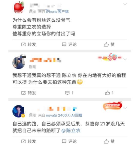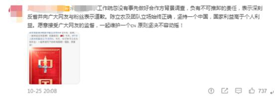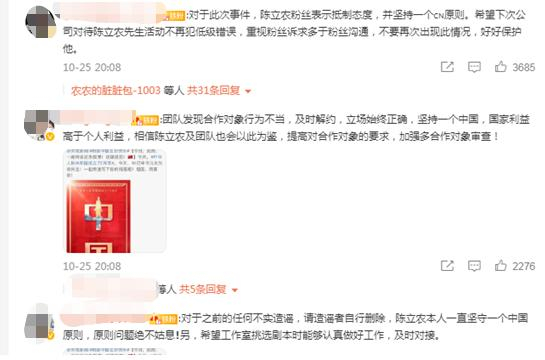 还有网友表示:相关娱乐公司工作疏忽没有事先做好合作方背景调查,负有不可推卸的责任,表示深刻反省并向广大网友与粉丝表示道歉。陈立农及团队立场始终正确,坚持一个中国,国家利益高于个人利益。愿意接受广大网友的监督,一起维护一个中国的原则坚决不容动摇!