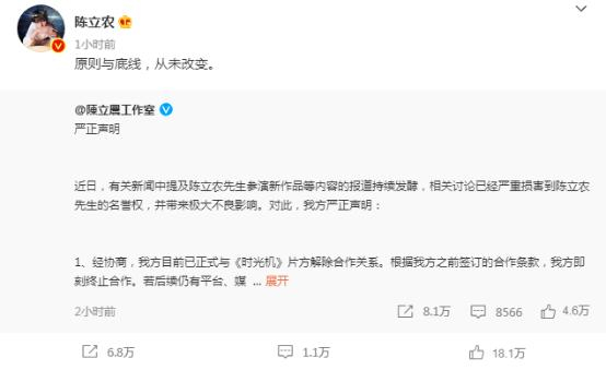 【环球网报道 记者 康博浩】据@新浪电影 25日消息,由爱奇艺IP授权改编的台湾电影《时光机》宣布开机,男主角由主要在大陆发展的台湾艺人陈立农饰演。不过很快有大陆网友扒出该片获得民进党当局资助,电影导演蔡怡芬还多次在社交媒体发布疑似支持“台独”、“港独”与抹黑大陆的言论。《时光机》电影宣布开机当天就被大量网友及陈立农粉丝质疑和抵制。对此,陈立农工作室25日晚发声明称,目前已正式与《时光机》片方解除合作关系,陈立农先生本人坚持“一个中国”原则不动摇。