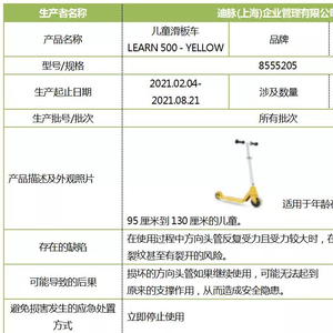 “上海市场监管”透露,迪脉(上海)企业管理有限公司将于10月27日,召回全部型号为8555205的OXELO儿童滑板车LEARN 500 - YELLOW,涉及1828件。被召回滑板车的生产起止日期为2021年2月4日至2021年8月21日。