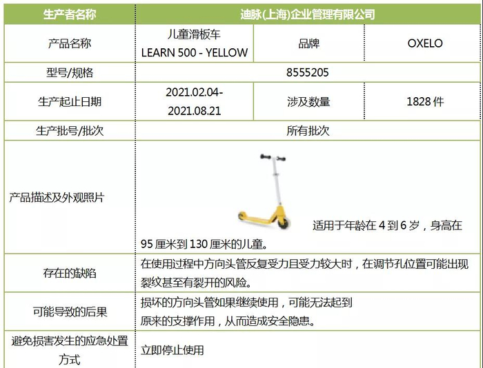 调节孔有裂开风险!迪卡侬召回1828件儿童滑板车