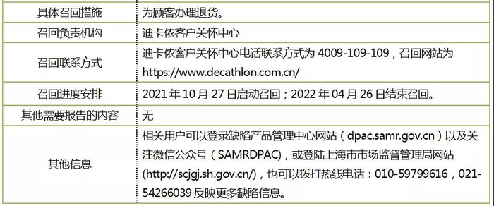 上海市市场监管局称,消费者应立即停止使用,迪卡侬客户关怀中心将为顾客办理退货。此次召回自2021年10月27日启动至2022年4月26日结束。(中新经纬APP)