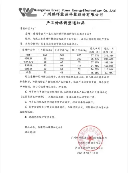 两周前,鹏辉能源也传出一份涨价函,公司罗列出主要电池材料的涨幅,决定所有新订单将执行大宗联动定价,上调幅度视各产品材料占比及涨幅而定,报价每周实时更新,不接受长周期、等通知投料和提货的订单。此外还将对未提货的订单重新议价,并全面缩短账期。