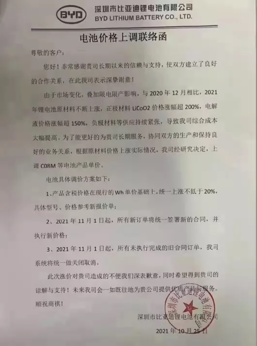 一份《电池价格上调联络函》显示,比亚迪(002594)决定上调CO8M等电池产品单价,产品含税价格在现行的Wh单价基础上,统一上涨不低于20%,2021年11月1日起,所有新订单将统一签署新的合同,并执行新价格,所有未执行完成的旧合同订单将关闭取消。