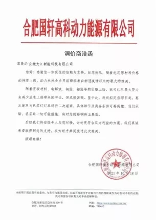 国轩高科也传出一份落款为10月18日的调价商洽函。公司在函中坦言,随着电芯原材料价格的持续上涨,动力电池企业目前面临着新馆疫情以来的最大的难关。随着正极材料、电解液、铜箔、铝箔等的价格上扬,公司已尽最大努力来减少成本上扬带来的冲击,但收效甚微。因此公司拟定就双方已签订订单进行二次磋商。记者就此函致电国轩高科了解细节,公司表示不方便透露具体情况。