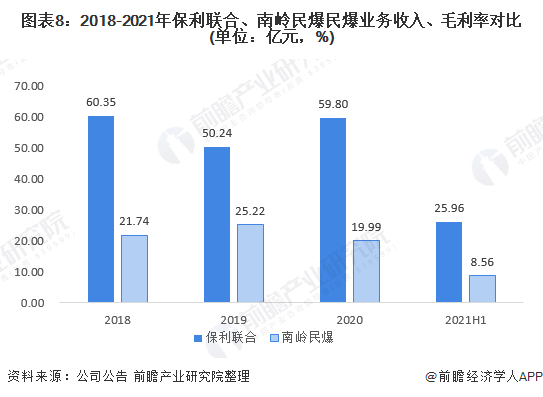 从民爆业务的经营情况来看,2018-2021年,保利联合的民爆业务收入均领先于南岭民爆,2021年上半年,保利联合民爆业务实现收入25.96亿元,南岭民爆的民爆业务实现收入8.56亿元。