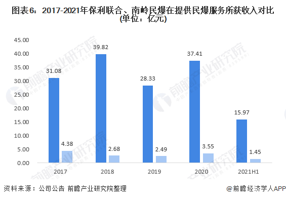 从提供民爆服务来看,保利联合通过提供民爆服务所获得的收入远超南岭民爆。截至2021年上半年,保利联合和南岭民爆提供民爆服务所获收入分别为15.97亿元和1.45亿元,保利联合处于绝对领先地位。