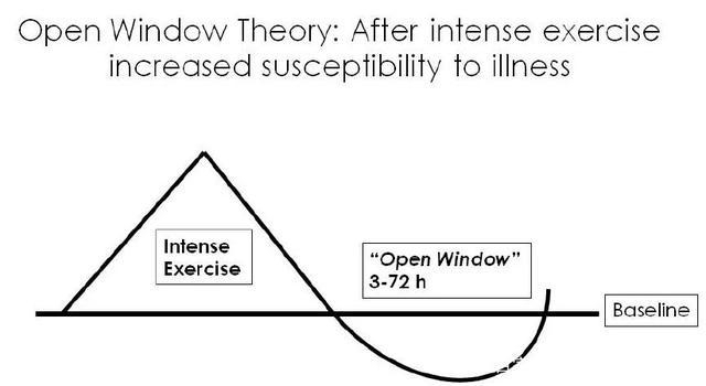 例如短期内突然进行大强度运动反而会降低我们自身的免疫力,特别是超过90分钟的高强度运动,这也被称为运动后免疫力降低的“开窗理论”。一般在高强度长时间运动后2-3小时开始,机体的先天性免疫系统开始进入繁忙工作状态,会导致免疫系统对外界抗原的抵抗力随之下降。因此,在此时更容易被病毒、细菌、真菌攻击,这个过程可能会持续至运动后24小时。因此在运动时应注意控制运动强度,循序渐进,同时注意运动后的恢复。