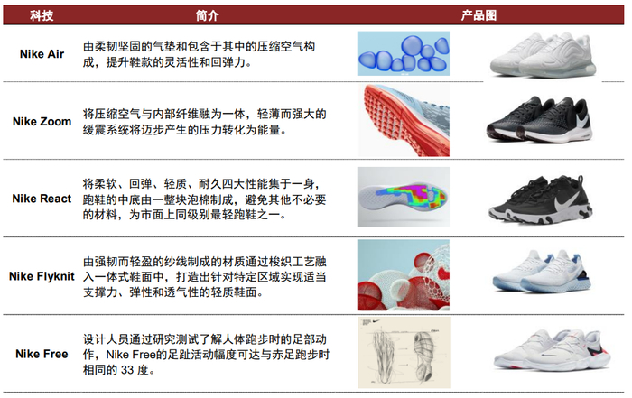 我们认为功能性与科技感是运动品牌获得成功的关键因素之一。贝恩咨询调查显示,中国运动健身人群在购买运动鞋服时最重视的两个因素为产品功能和智能科技,我们认为功能性运动鞋服产品拥有更高的增长潜力。运动鞋服品牌正在纷纷加大运动科技领域的布局创新,如Nike在产品研发中对功能性和科技创新持续追求,奠定其作为国际运动品牌领头羊的产品基础,Nike自1979年推出Tailwind跑鞋至今,产品技术不断更新迭代,演变出了Nike Air、Nike Zoom等多项核心技术,并应用于跑步、篮球、综训等多个领域,提升了产品力。