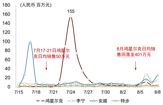 鸿星尔克热销体现消费者对本土品牌消费热情高涨。7月21日,鸿星尔克官方微博宣布将通过郑州慈善总会及壹基金向遭受暴雨灾情的河南省捐赠5,000万元物资[1]。相关话题一度登顶微博热搜榜首,并逐渐扩散到其他网络平台。鸿星尔克持续提升的热度驱动了短期线上销售的强劲增长,从天猫官方旗舰店销售情况来看,自7月22日开始,鸿星尔克天猫官方旗舰店销售额激增,7月24日单日销售额超过1亿元,店铺产品动销率也从此前平均的30%-40%提升至70%以上。随着捐款热度逐渐消退,8月份鸿星尔克日均销售额回落至401万元,平均动销率约73%,仍远高于此前水平。从抖音直播间的销售情况来看,7月18-21日鸿星尔克日均销售量仅412件,7月22日突破41万件,并连续3天在万件以上。截至7月26日,鸿星尔克官方直播间粉丝数量达1,363万人,大幅超过其他品牌。
