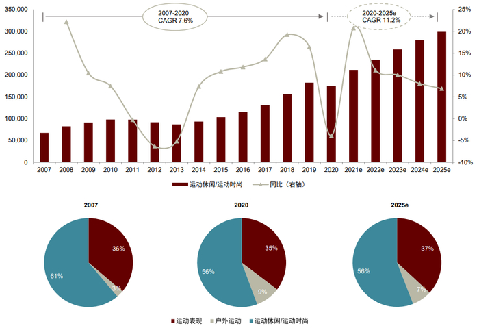 运动休闲品类未来增长有望加速。麦肯锡《2021全球体育用品业报告》指出,2020年受新冠疫情影响,众多员工居家办公,出于对实用性和舒适性的需求,消费者更加偏爱运动休闲品类。报告同时显示,约76%的行业专家认为运动休闲市场将保持增长,其中33%的专家认为增速会较疫情前加速。