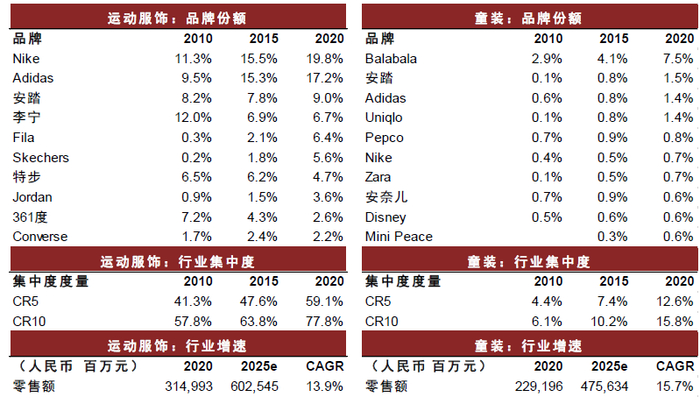 儿童鞋服市场集中度低,行业整合空间大。Euromonitor统计数据显示,2020年中国童装行业CR10仅为15.8%,远低于运动服饰的77.8%。同时,中国运动童装占整体运动服的比例仅7%,与英国的22%和美国13%的水平仍有一定的差距。Euromonitor预测2025年中国童装市场规模将达到4,756亿元,5年复合增速15.7%。我们认为儿童运动鞋服同样具备功能性壁垒,未来行业集中度有望进一步提升。