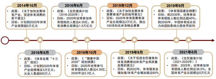 ► 锻炼人数方面,《“健康中国2030”规划纲要》公布2015年经常参与体育锻炼的人数为3.6亿人,2020年的政策目标是达到4.35亿人,CAGR为3.86%;2030年达到5.3亿人;2035年达到人口比例的45%[10]。2021年8月,《全民健身计划(2021-2025年)》提出新目标,到2025年经常参加体育锻炼人数比例达38.5%。