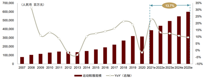 中国拥有世界第二大运动鞋服市场。Euromonitor数据显示,2020年中国是规模仅次于美国的全球第二大运动鞋服零售市场,也是增长最快的国家之一。2015– 2020年,我国运动鞋服规模由1,669亿元增长至3,150亿元,复合年增长率13.5%,Euromonitor预计2025年国内运动鞋服规模将达到5,990亿元,对应复合年增长率13.7%。