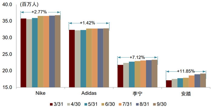 国家政策支持促进运动鞋服消费提升。我们认为,政府对全民健康事业给与了越来越多的引导和投入,将促进我国运动参与人数上升。大众运动消费观念不断加强,全民健身热潮兴起将利好运动鞋服的消费频次和消费单价上升,支撑行业长期健康发展。