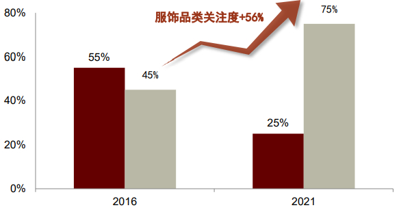 政策扶持、爱国热情及品牌力提升助力本土品牌崛起。政策方面,近年来我国频繁推出体育相关促进政策,把全民健身上升为国家战略——2021年最新发布的《全民健身计划(2021-2025年)》提出总量目标,到2025年中国体育产业规模达5万亿元。从需求端看,经济腾飞、民族自信、文化自豪、新基础设施完善助力国潮消费全面兴起,中国服饰品类本土品牌关注度在2016到2021年间增加了56%。我们发现“爱穿、爱运动、注重功能性”是服装行业消费新潮流,有望驱动运动鞋服行业延续高增长、高景气。从供给端看,本土品牌愈发注重创新研发,新产品、新科技层出不穷,同时借助多维度营销建立品牌知名度和美誉度,并通过DTC改革和供应链提效进一步提升隐形实力。