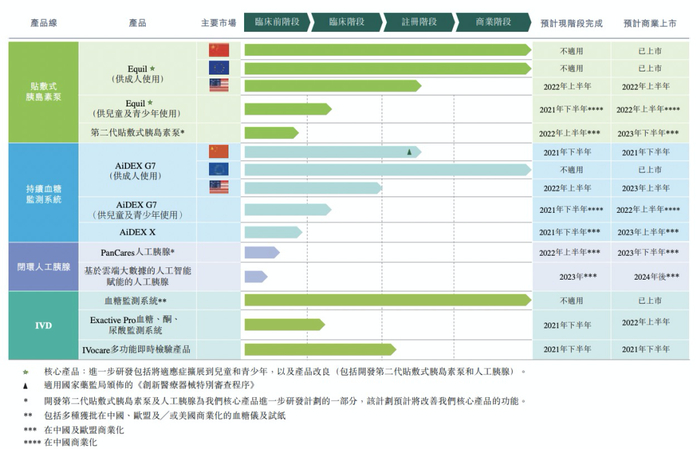 从在研管线来看,微泰医疗重点布局的是新一代持续血糖监测系统和人工胰腺。前者为AiDEX X,采用新技术,尺寸更小,可弥补AiDEX G7的不足。其计划在今年下半年完成产品原型试生产和生产流程优化,2022年下半年完成临床试验,并向国家药监局提交注册申请。后者是一种全面糖尿病管理医疗器械,可以使用持续血糖监测仪跟踪血糖水平,并在需要时自动输注胰岛素,但尚未完成工程验证,问世需要较长时间。