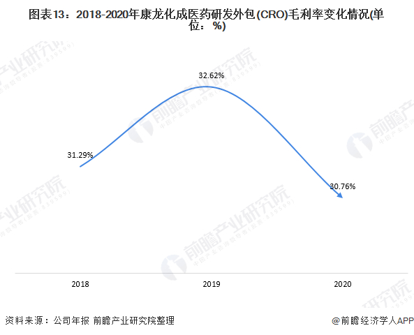 从毛利率上看,2018-2020年,康龙化成毛利率整体呈现出倒V态势,但仍保持在较高水平;2020年,康龙化成医药研发外包(CRO)毛利率仍达30.76%,企业盈利状况较为可观,