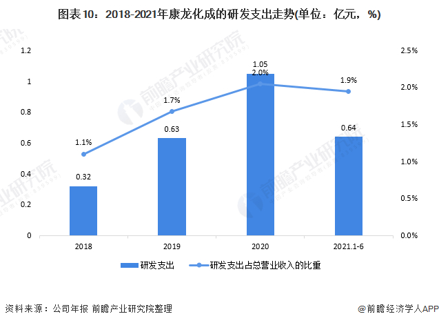 近年来,公司的研发支出呈现逐年上升态势;从2018年的0.32亿元上升至2020年的1.05亿元;研发支出占营业收入的比重呈现稳步上升,从2018年的1.1%上升至2020年的2%。2021年上半年,公司的研发支出达到了0.64亿元,占营业收入的比重为1.9%。