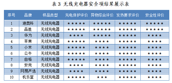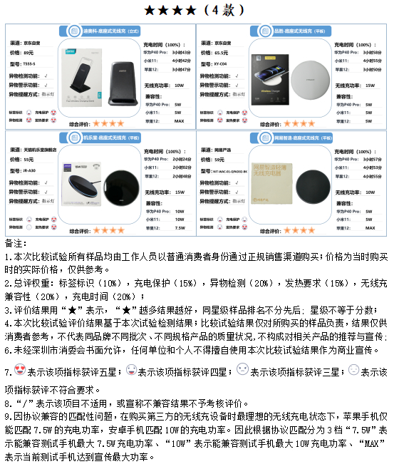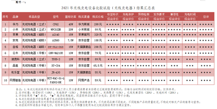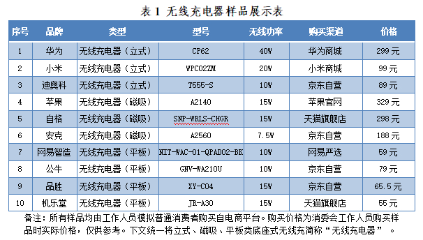 本次无线充电设备模拟普通消费者从线上购买了10款无线充电器样品(样品信息详见表1),对标签标识(Qi标识与认证、产品本体标识、环保标识)、安全(充电保护、异物检测FOD、发热要求)、性能(无线充兼容性、充电时间)等三个方面进行测试并进行权重打分,评价结果用“★”表示,星级越多表示结果越好,同星级样品排名不分先后。