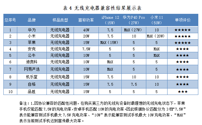 手机与无线充之间的兼容性不好、发热严重、硬件不匹配等都会导致充电速度慢。目前我国尚无统一的无线充电设备兼容性测试标准,因此,本次兼容性测试模拟普通消费者的实际使用场景下进行,从无线充电器给三个测试手机的实际输入功率、宣称值进行考核。结果显示,华为、小米、苹果3款无线充电器的兼容性较好,且充电速度最快。