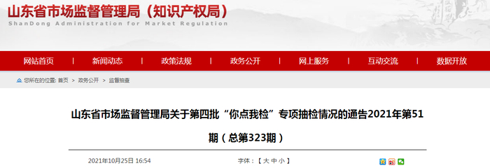 中国质量新闻网讯 2021年10月25日,山东省市场监督管理局网站发布关于第四批“你点我检”专项抽检情况的通告2021年第51期(总第323期)。