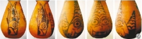 史前狰狞的獠牙神面也偶尔出现在仰韶文化彩陶上。在属于仰韶文化的陕西临潼半坡文化遗址(距今6000多年)出土的一件陶瓶上,绘有一个戴着尖顶帽的神面,宽大的嘴角向上,龇出一对大獠牙,但只有下獠牙,没有上獠牙。神面的左右还绘有一对倒立的大鱼,暗示着半坡文化这样的神面与鱼崇拜有关,也许是鱼之神(见图⑥)。