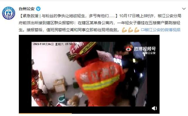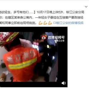 据台州公安,10月17日晚上8时许,椒江公安分局府前派出所接到辖区群众报警称:在辖区某单身公寓内,一年轻女子悬挂在五楼窗户要跳楼轻生。