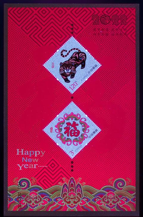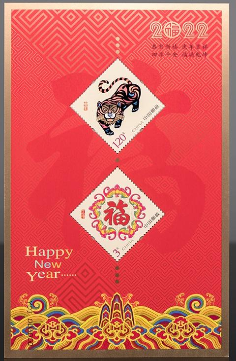 注:采用“壬寅大吉”和“五福临门”邮票印制小全张1枚,规格为120×190毫米。小全张专用于2022年中国邮政贺年有奖产品(祝福卡型15元)。