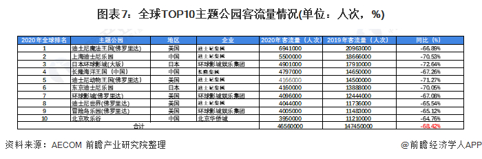 根据AECOM统计数据,2020年全球排名前10位(按照2020年客流量排序)的主题公园分别为:迪土尼魔法王国(佛罗里达)、上海迪士尼乐园、日本环球影城(大坂)、长隆海洋王国(中国)、迪士尼动物王国(佛罗里达)、东京迪士尼乐园、环球影城(佛罗里达)、迪士尼世界(佛罗里达)、冒险岛乐园(佛罗里达)、北京欢乐谷。其中有5家在美国地区、3家在中国。环球影城娱乐集团旗下4家在全球主题公园中排名中,三家入围TOP10。