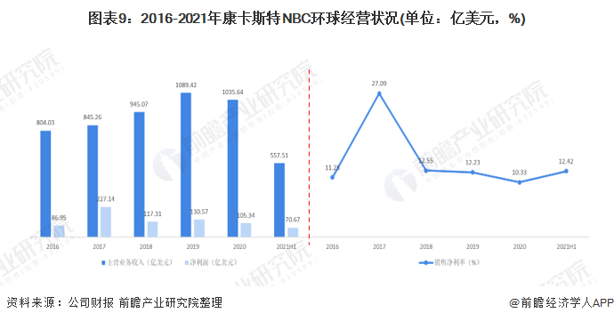 从康卡斯特NBC环球经营状况来看,2016-2019年主营业务收入不断增长,2019年达1089.42亿美元为近年最高,2020年受疫情影响略有下滑,2020年康卡斯特NBC环球收入为1035.64亿美元。从盈利能力来看,销售净利率在10%,盈利能力较稳定。整体来看,康卡斯特NBC经营情况较好。