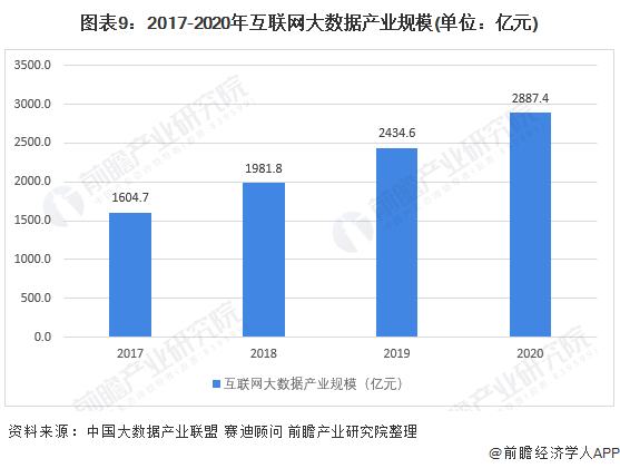 根据赛迪数据,我国大数据产业在互联网领域的应用占比约为45.2%。据测算,2017年,中国互联网大数据产业规模达1604.7亿元,2020年约为2887.4亿元。
