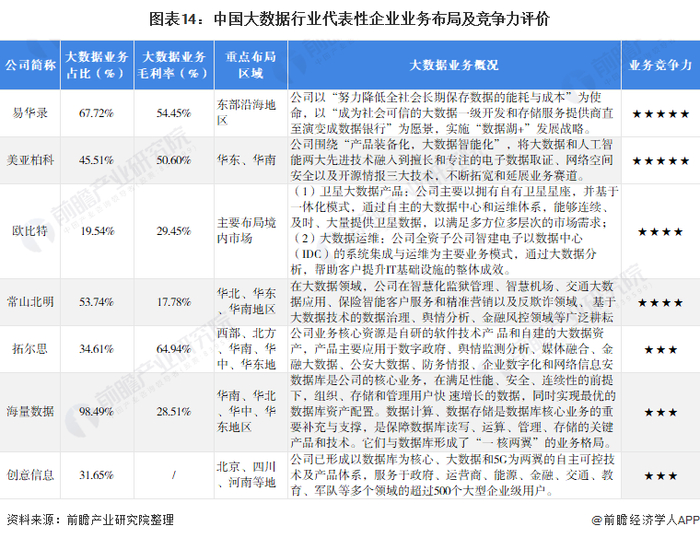 我国大数据代表性企业的重点布局区域侧重于东部沿海地区和京津冀地区,比如易华录主要布局东部沿海地区,美亚柏科主要布局华东、华南地区等;从产品布局来看,各公司各有侧重点,例欧比特在卫星大数据领域拥有绝对话语权,龙头企业的竞争优势明显。