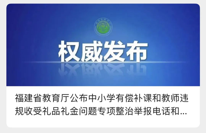 福建:为进一步规范中小学教师职业行为,根据相关要求,将全省各级教育行政部门专项整治举报电话和邮箱向社会公开(点击查询举报方式)