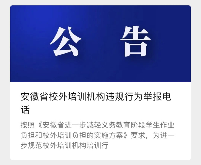 安徽:为进一步规范校外培训机构培训行为,畅通监督举报途径,发挥群众监督举报作用,将教育行政部门校外培训机构违规行为举报电话予以公布(点击查询举报方式)
