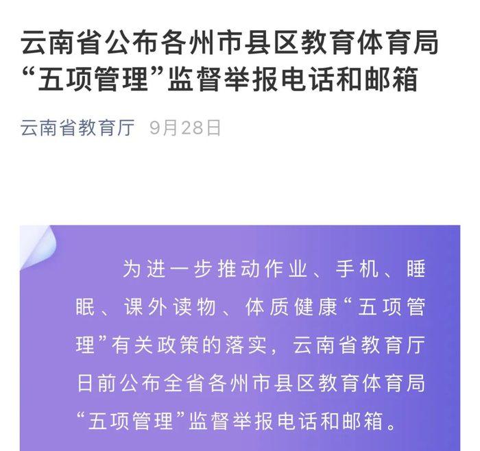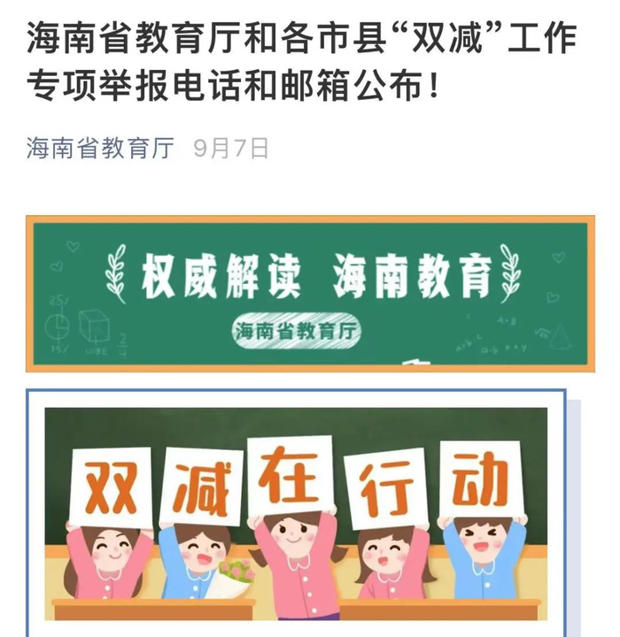 海南:向社会公布省教育厅以及各市县教育局“双减”工作举报电话和邮箱,可通过举报电话和邮箱反映问题线索(点击查询举报方式)