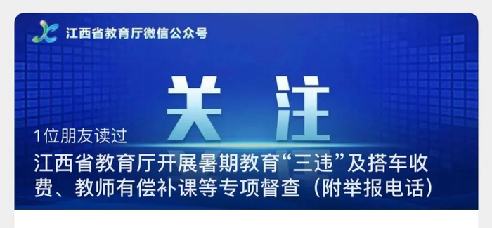 江西:在全省范围内开展教育“三违”(违规补课、违规收费、违规推销教辅材料)及搭车收费、教师在校外培训机构兼职及有偿补课专项督查,附举报电话(点击查询举报方式)