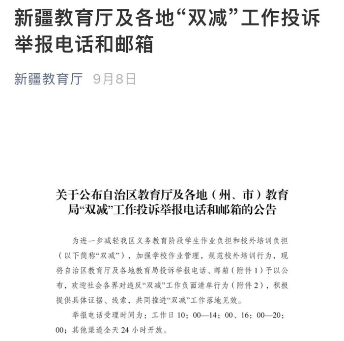 黑龙江:公布各市(地)“双减”工作专门协调机制办公室监督举报方式及“十项整治行动”专门监督举报方式,请学生、家长、社会各界共同监督(点击查询举报方式)