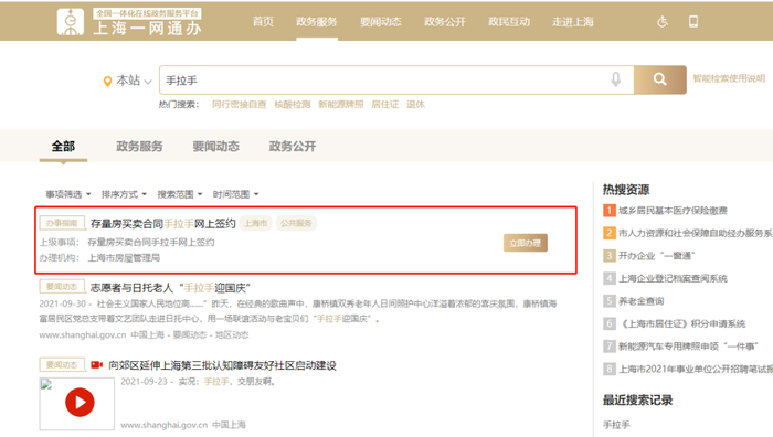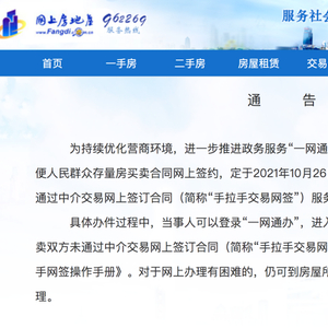 10月26日,上海市房地产交易中心官方平台“网上房地产”发布公告称,为持续优化营商环境,进一步推进政务服务“一网通办”,让信息多跑路、群众少跑腿,方便人民群众存量房买卖合同网上签约,定于2021年10月26日在“一网通办”开通存量房买卖双方未通过中介交易网上签订合同(简称“手拉手交易网签”)服务。