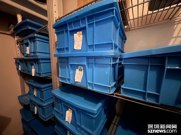 肯德基采用的是透明厨房设计,在点餐处即可看到后厨环境。执法人员随后分别对炸制间、洗碗间、仓库、保鲜库等进行了细致检查,并询问了餐厅负责人关于冻库食材的保质期问题。餐厅负责人称,肯德基冻库内的每一份食材都贴有颜色标签,不同颜色代表不同的到期日期,以防员工使用已过期的材料进行食品加工。