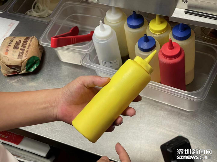 随后,记者跟随执法人员来到了汉堡王,汉堡王与肯德基一样,采用的是透明厨房设计,食品安全量化等级也为A级。执法人员首先对汉堡制作台上的酱料瓶进行检查,发现部分调料缺少名称及使用日期标签,执法人员要求餐厅进行整改。随后又对餐厅的炸制用油进行了检查,执法人员要求餐厅负责人拿来检查炸制用油过氧化值和酸价的器材,现场对油进行了检测,器材显示油的质量仍处于安全范围内。