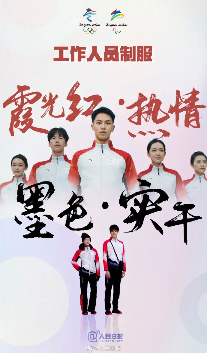 在色彩选择上,沉稳的墨色和跃动的霞光红展现了工作人员的实干和热情;中性的长城灰彰显技术官员的客观公正;明亮的天霁蓝展示出志愿者的青春活力;纯洁的瑞雪白作为调和色象征着“瑞雪兆丰年”。墨色、霞光红、长城灰、天霁蓝、瑞雪白这几种色彩勾勒出冬奥会恢宏场景与空间意境,以及冬季运动的节奏感和韵律感。