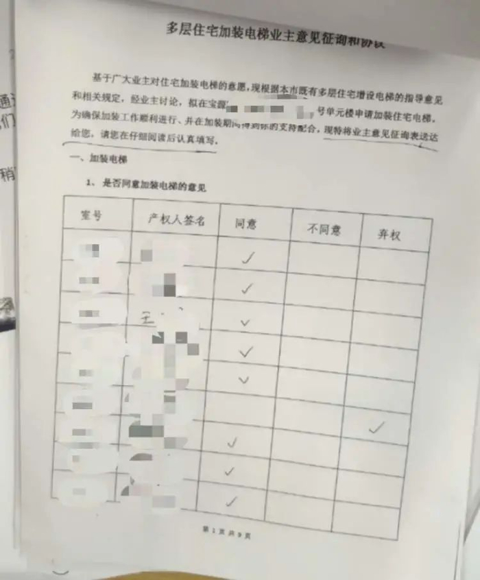 《多层住宅加装电梯业主意见征询和协议》中